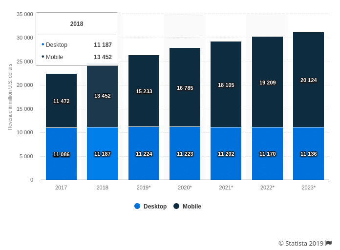 The United States forecast says that the mobile banner ad revenue is going to grow from 11.47 billion USD in 2017 to 20.12 billion in 2023.