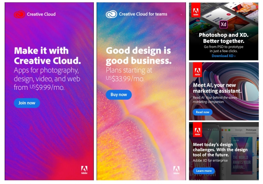 There is no other better testimonial than the product itself. While sometimes, especially when you sell software, you cannot show the product itself on a single banner, you can use your creativity to show your customers what your products are good for. This is where Adobe’s banners are at their best. They are not just beautiful in design but also effective, because they advertise the outcome, not just the means.