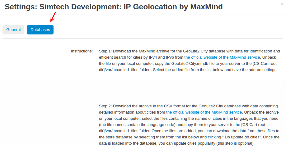 Open the add-on settings again and go to the Databases tab. You should see the names of the added files. Click the Update db cities button to update cities in the database.