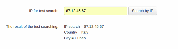 You will also see the IP for test search field added. This field is for testing purposes. Enter any IP address into the field to see the country and city of the entered IP address. For example:
