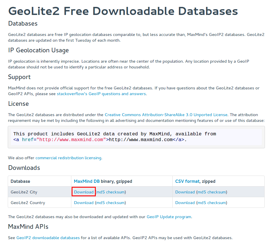 Follow the instructions to download the database archives from the MaxMind website and unpack them in the right directory. You should download these two archives: