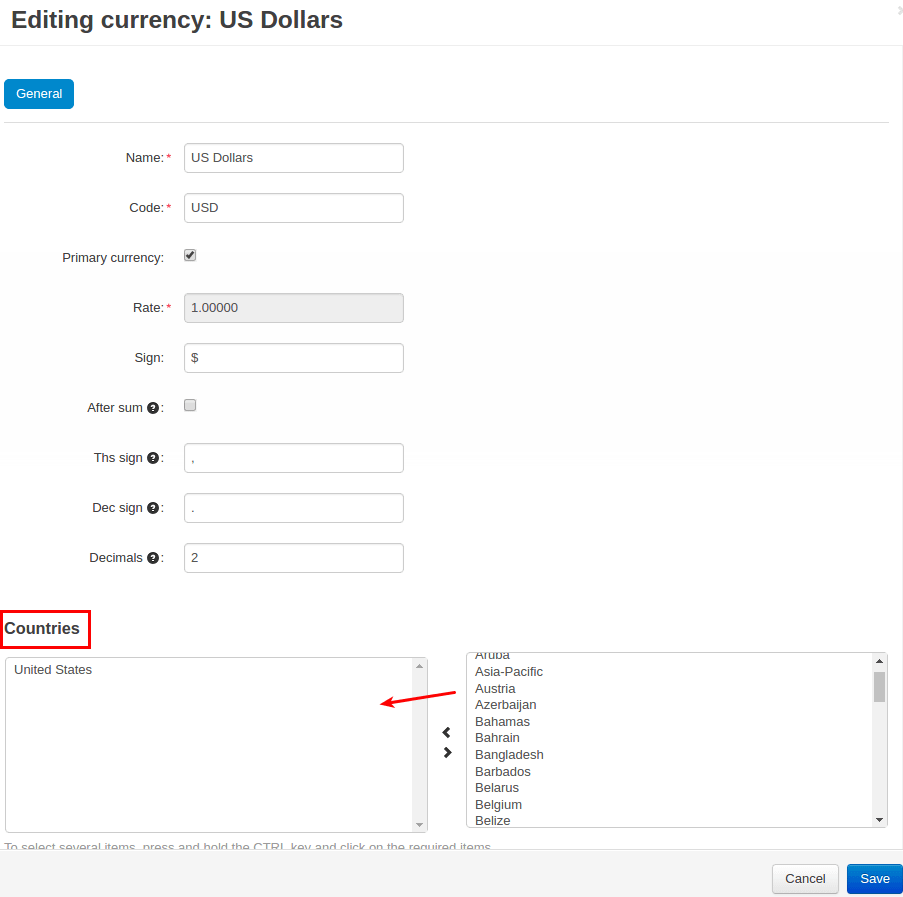 On the currency editing page, select the countries you’d like to set the currency for and move them to the left section.