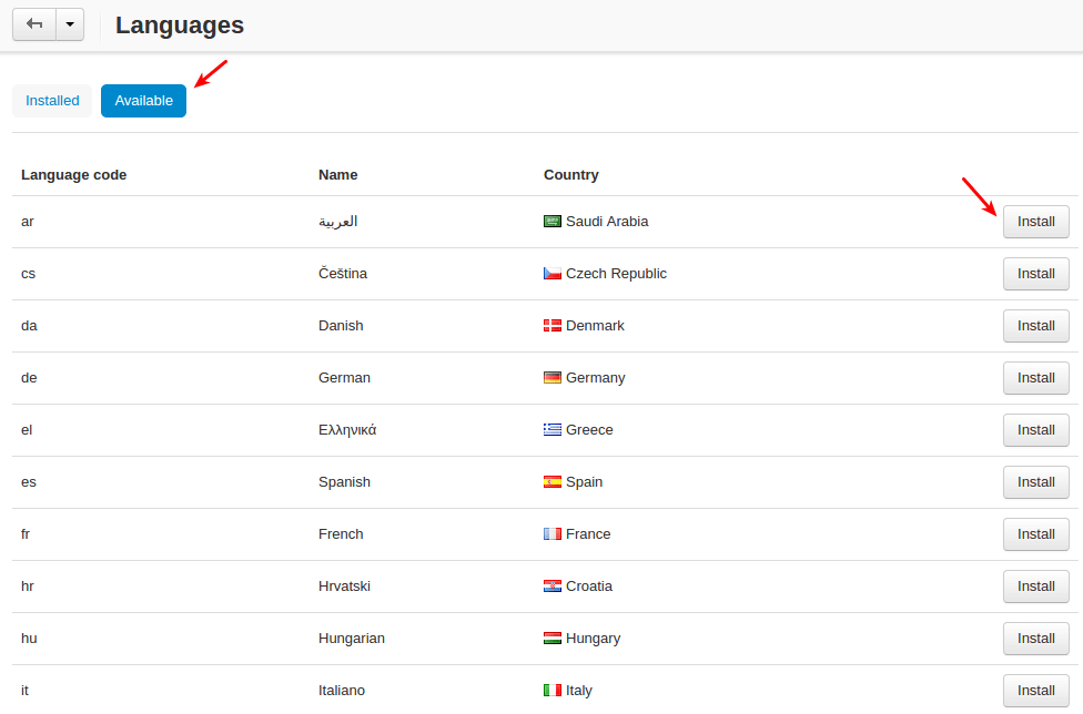 If you do not have the required language on the list, switch to the Available tab and install the desired language by clicking the corresponding button.