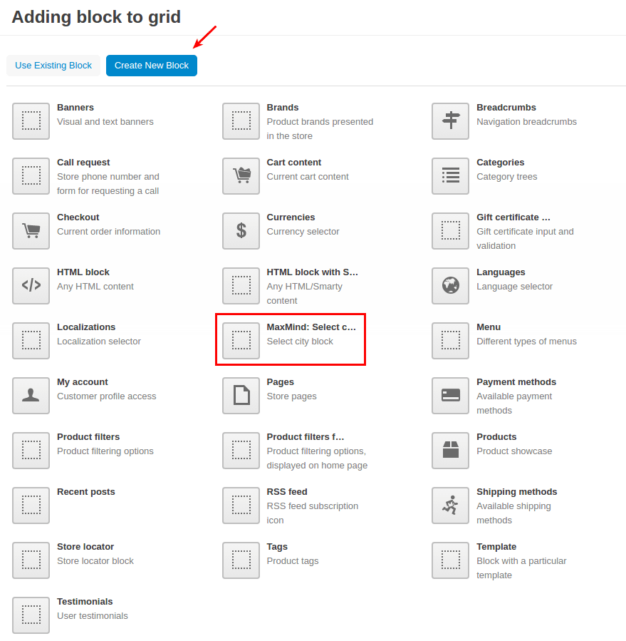 - In the pop-up window, go to the Create New Block tab and select the corresponding block.