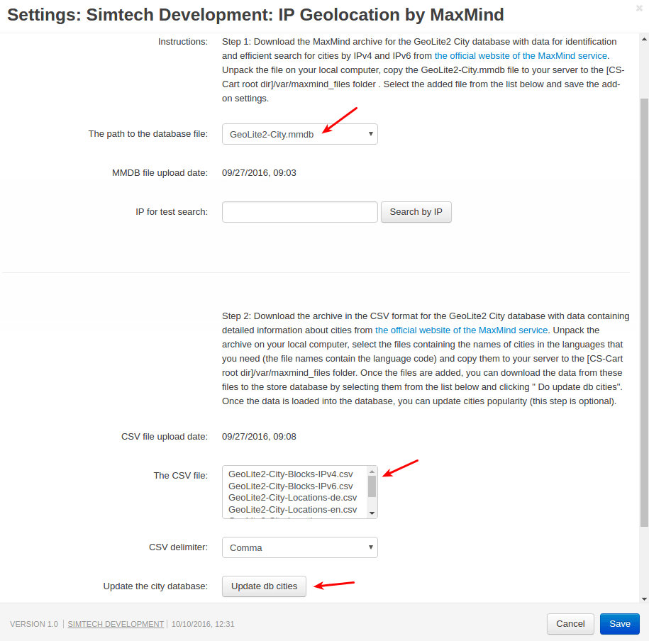 Open the add-on settings again and go to the Databases tab. You should see the names of the added files. Click the Update db cities button to update cities in the database.