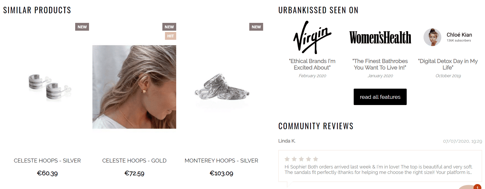 Putting customer ratings and reviews at the heart of your product pages, you add trust to your brand, but not only. Reviews and recommendations are not the only type of social proof. This can be also some awards or acknowledgments. Bringing your brand social proof to the product page creates a positive image of your brand on the most important page of the website!