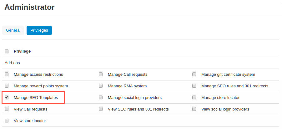 - Open the Privileges tab and select the Manage SEO Templates checkbox if you want to allow vendors in this group to manage SEO templates or clear the checkbox if you want the opposite.
