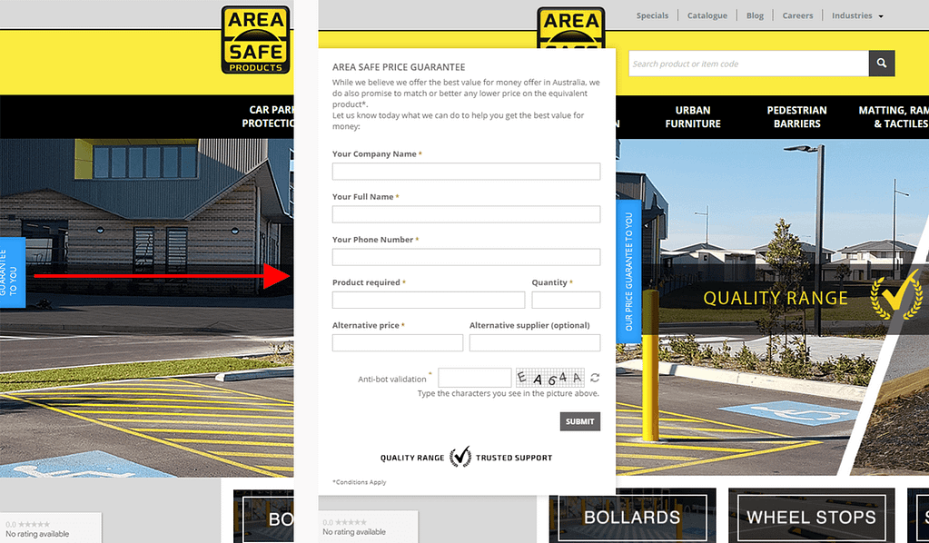 One more request implied the creation of a floating button on the left side of the browser which included a pull-out form. The goal was to promote the price match guarantee and allow customers to submit the form if they have found a cheaper price elsewhere.