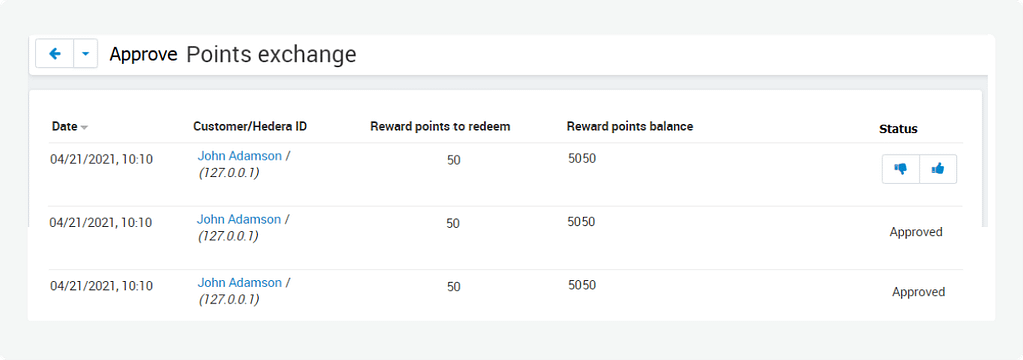 - Approve points exchange contains all the requests from customers to redeem the points for tokens with the possibility of the administrator to Approve/Disapprove the request.