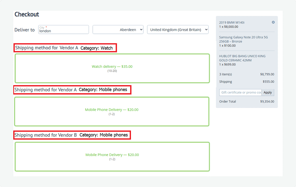 For example, if the vendor sells mobile phones, then the checkout page offers one of 3 delivery options: