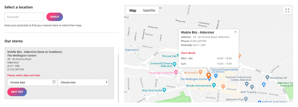 A nice feature proposed by the website Product Manager was a ‘Book a Repair’ button. The idea behind this element was to provide a visitor with a simple tool to guide through the purchase funnel. We developed, designed and integrated Book a Repair placed on the homepage next to the Company logo and the further back- and front-end functionality triggered by that key. The button initiates the following steps: