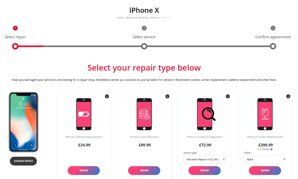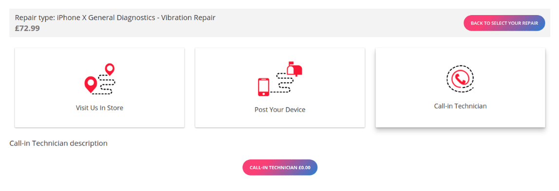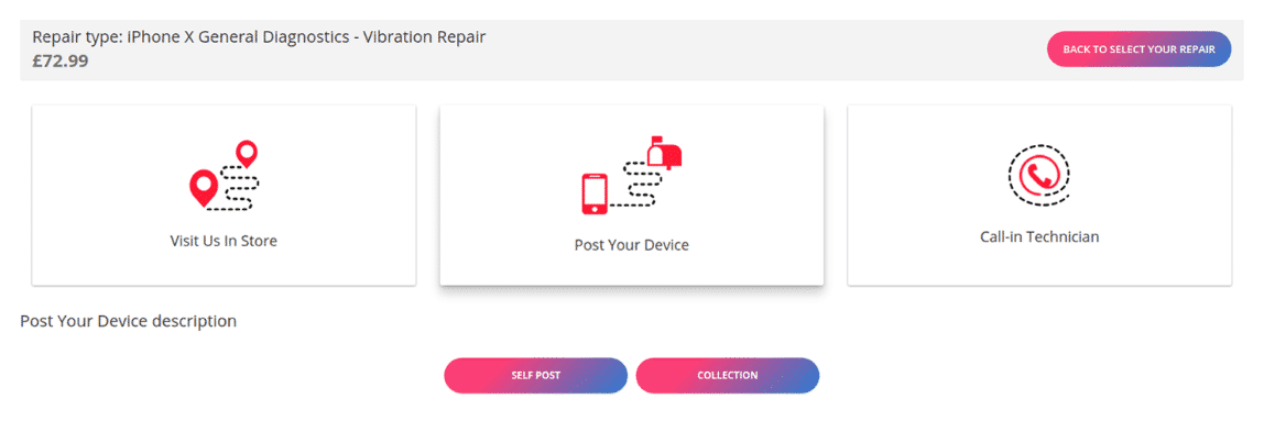 1. Select Repair: you select the repair type for a chosen device and its make.
