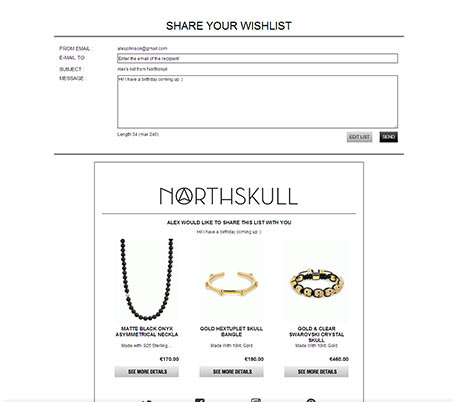 Using the Wishlist functionality, it is possible to create a stylish list of products and share it with friends.