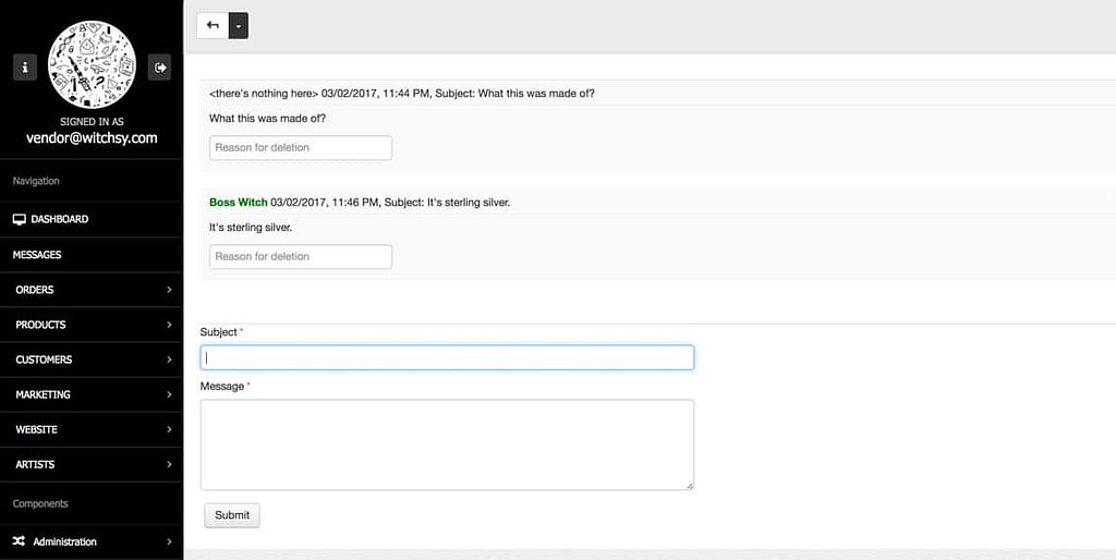 We created a new menu item in the administrator and vendor panels called “Messages”. It enables customers to send messages to vendors from the product page and vendor page. Sent messages are displayed in the customer’s account. The artist also sees the received message in their account. The number of unread messages are displayed as well.