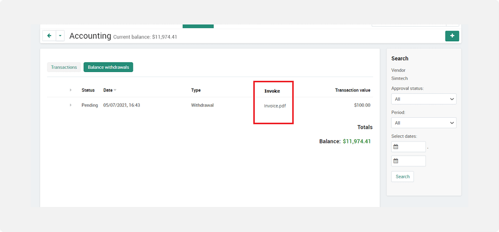 The Your Mart Compnay state legislation requires that there must be an invoice for each transaction. It was required to add an ability to upload invoices for each payment in the Accounting -> Withdrawal tabs. When a vendor requests a payout, it uploads a PDF file that both the vendor and the administrator can see.