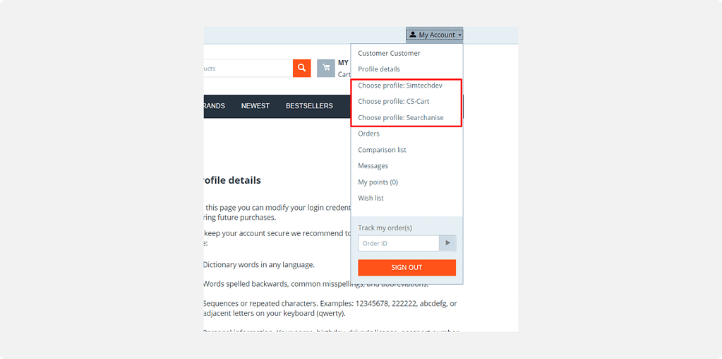 We modified the project accordingly so that each client could place an order exactly from the organization that makes purchases on the site, and the information of the selected profile is displayed in the invoice. Our team developed a dedicated add-on for this functionality. It extends the standard multiprofile functionality. On the storefront we added an ability to choose a profile in the “My profile“ block. The profile fields from the chosen profile are used at checkout.