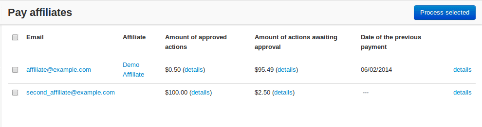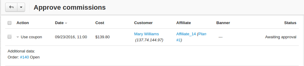 A list of all commissions that the administrator should pay to the affiliates is available under Marketing > Affiliates > Approve commissions.