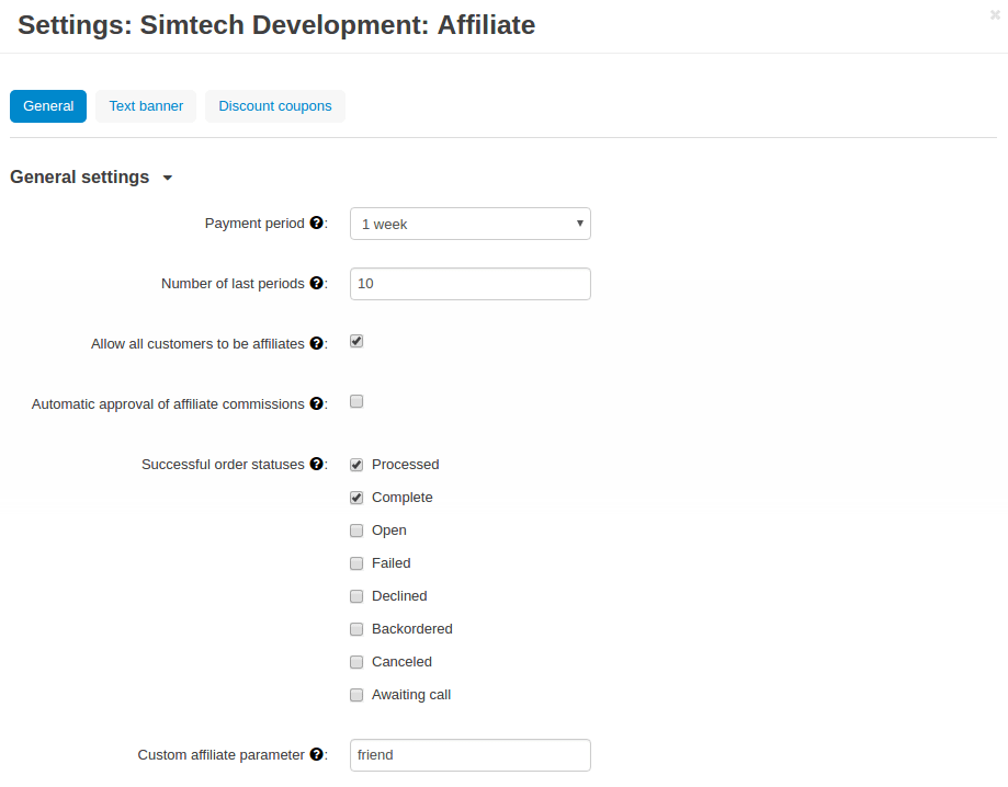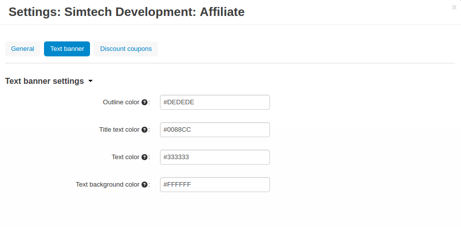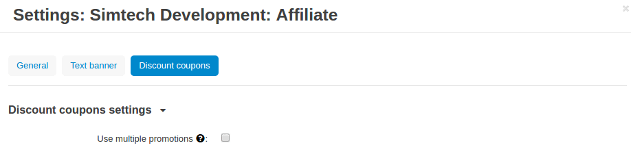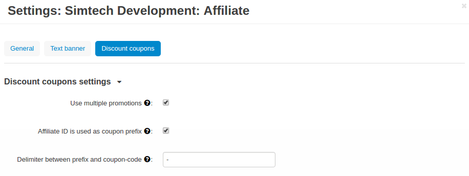 All settings of the “Affiliate and Referral” add-on are split into three sections: General, Text banner, Discount Coupons.