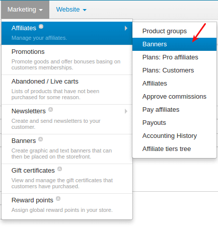 To go to the Banners manage page, please use the menu Marketing → Affiliate → Banners.
