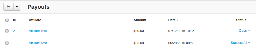 On this page, you can see current payouts to affiliates. Payouts can have the Open (awaiting payout) or Successful (successfully paid payout) status.