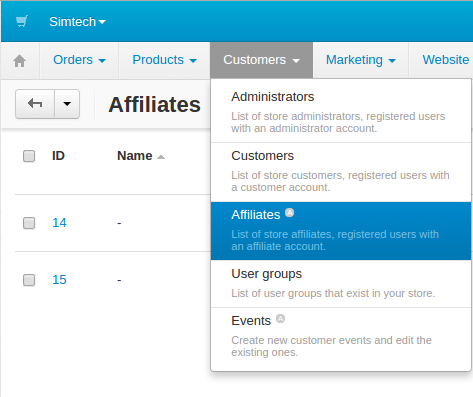 To access the Manage affiliates page, go to “Customers” → “Affiliates”.